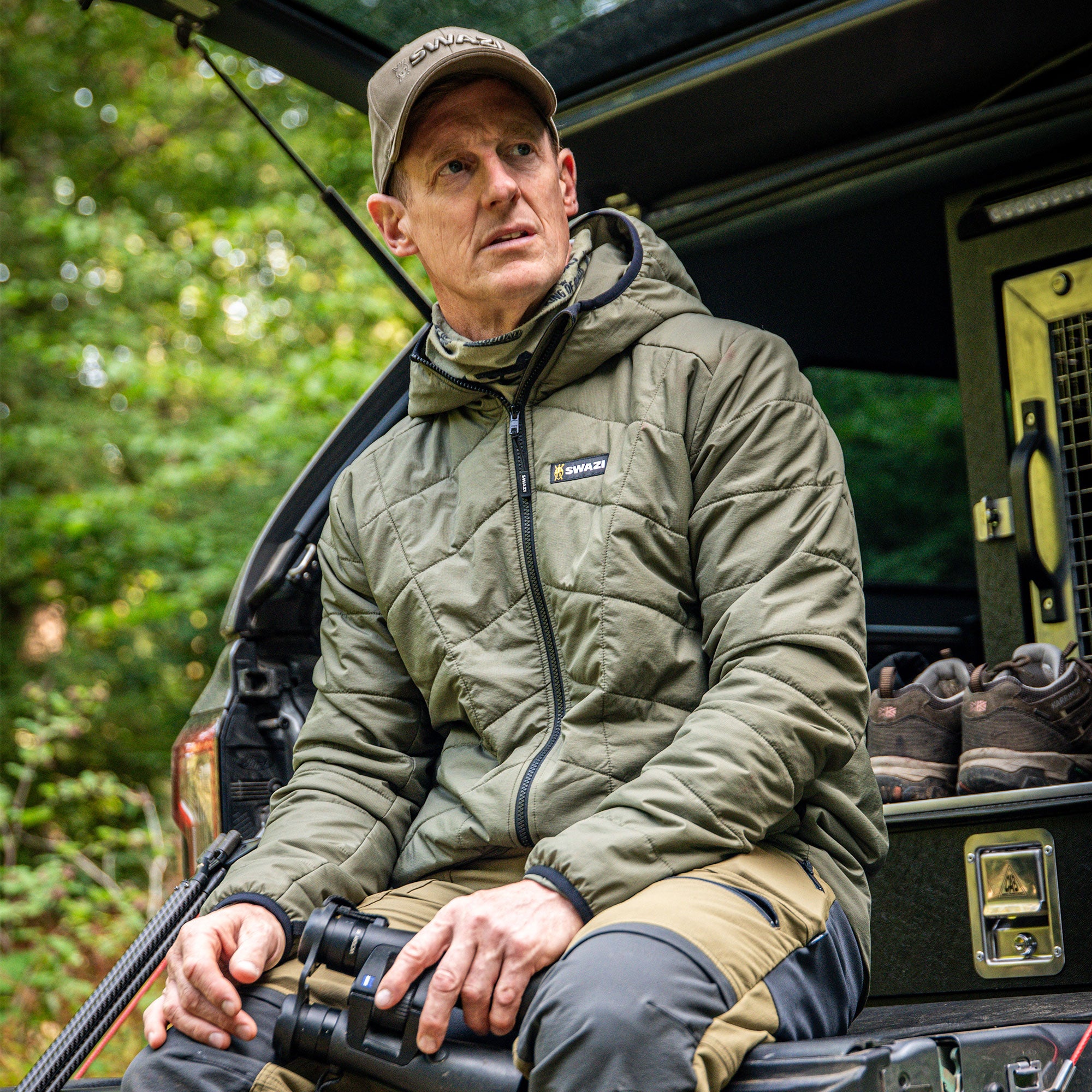 Featuring a high-collared hood with a brushed throat tab, secure zippered pockets inside and out, and gathered sleeve hems to lock in warmth, every detail is designed with the outdoors in mind. Available in Granite and Ranger, the Chamois Insulation Jacket is Swazi-engineered for those who need reliable warmth, wherever the mission takes them.